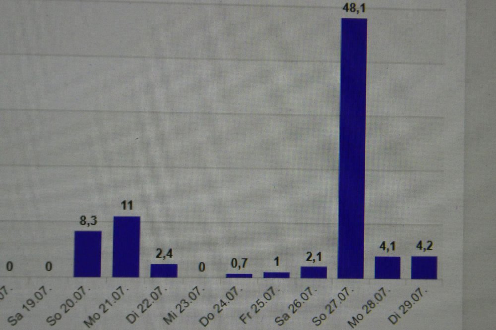 Eben wieder "Bindfaden-Regen" und die große Klatsche soll erst noch kommen, am Freitag mit über 40 Liter noch oben drauf!