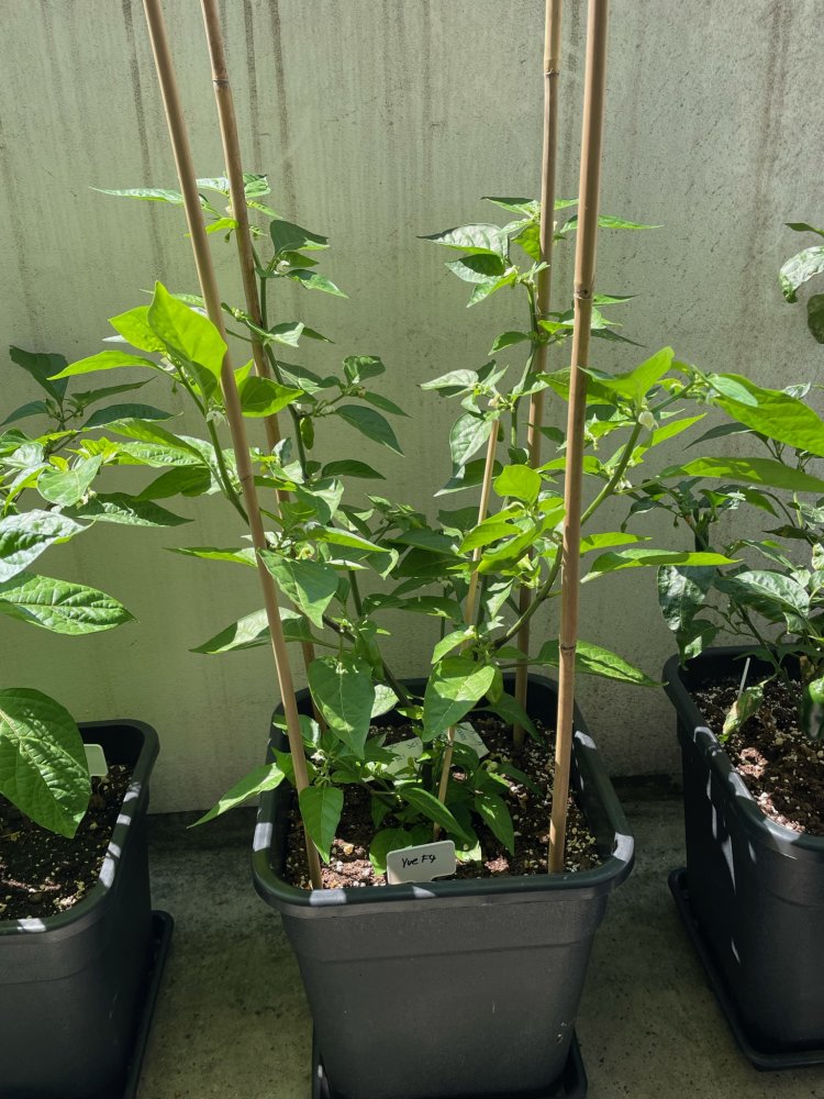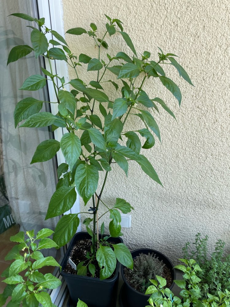 Meine zwei Pflanzen sind etwas unterschiedlich gewachsen. Ein Teil des Unterschieds könnte aber auch am Standort gelegen haben, denn eine stand länger im Growzelt als die andere. Die eine Yve F4 ist ziemlich buschig gewachsen, die andere ist sehr in die Höhe gegangen. Die buschige Pflanze steht mittlerweile auf dem Balkon, die zweite seit gestern im Gewächshaus. Die Pflanze im Gewächshaus hat Blüten, die mehr nach Capsicum annuum aus. Früchte sind noch keine dran.